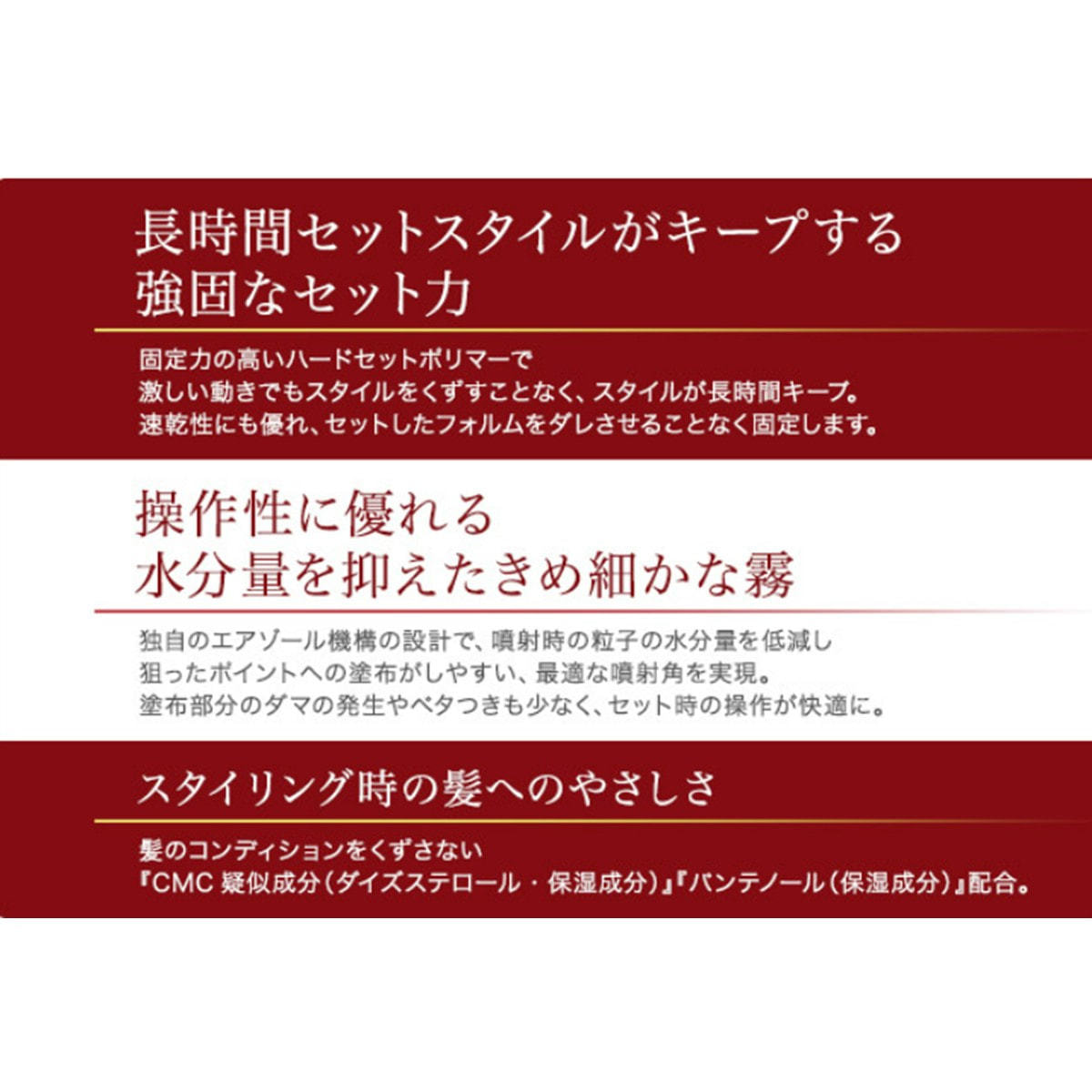 固定力の高いハードセットポリマーで、激しい動きでもスタイルをくずすことなくスタイルを長時間キープします。