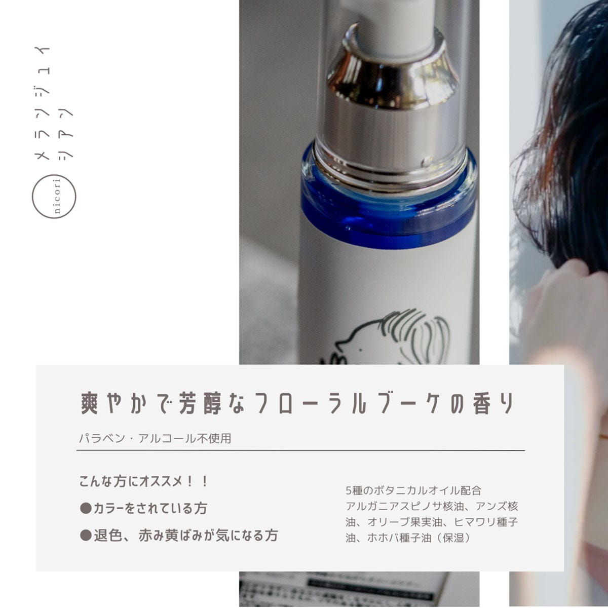 染料がヘアカラーの褪色を防止し、ツヤのある鮮やかな髪へと導くアウトバストリートメントオイル。