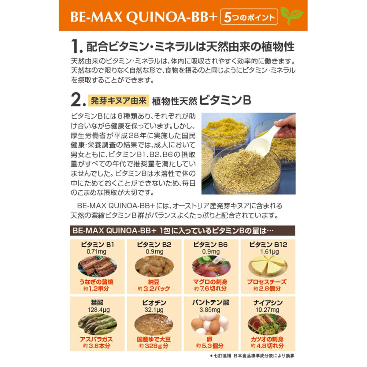 BE-MAX QUINOA-BB+は、特殊な製法によりビタミンB群をたっぷり含んだオーストリア産「発芽キヌア」を使用。
