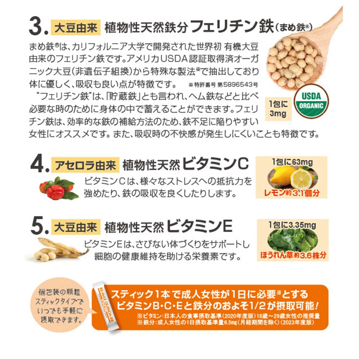 高濃度天然ビタミンB群、アセロラビタミンC、大豆ビタミンEに加え、大豆由来のフェリチン鉄(まめ鉄®)を新配合!