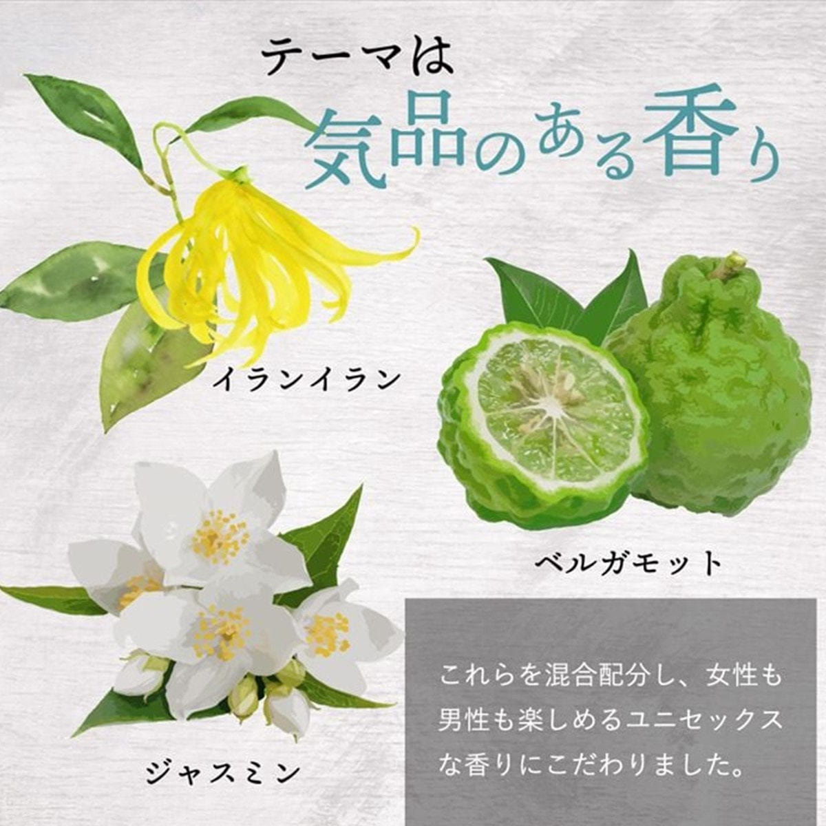 イランイラン、ジャスミン、ベルガモット。