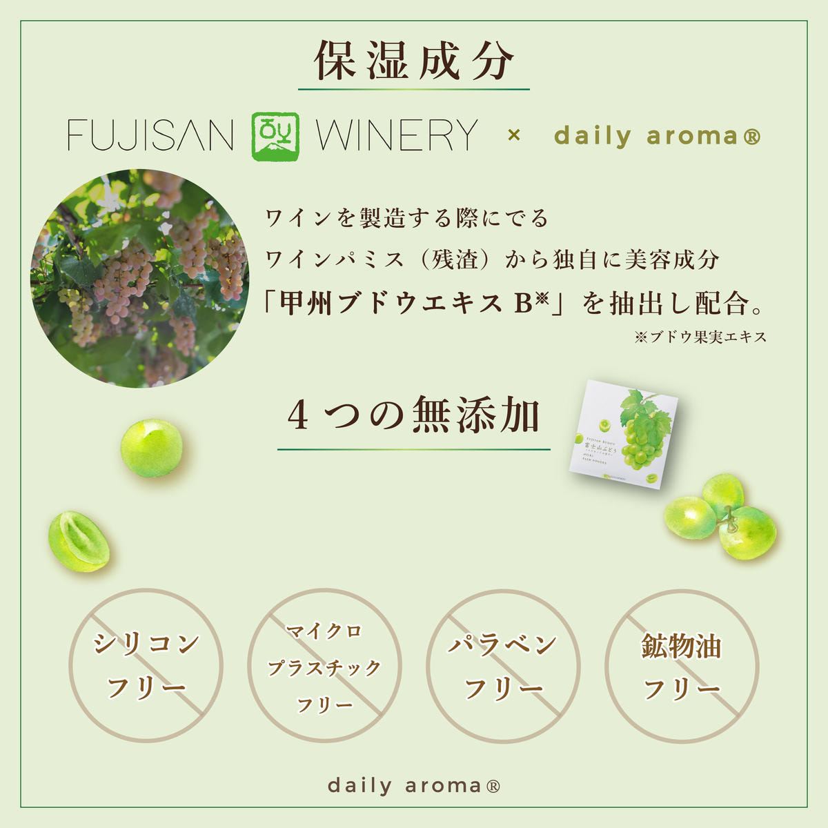 甲州ブドウエキス(ブドウ果実エキス)、アルガニアスピノサ核油(アルガンオイル)、ツバキ種子油、ハチミツ、パパイン